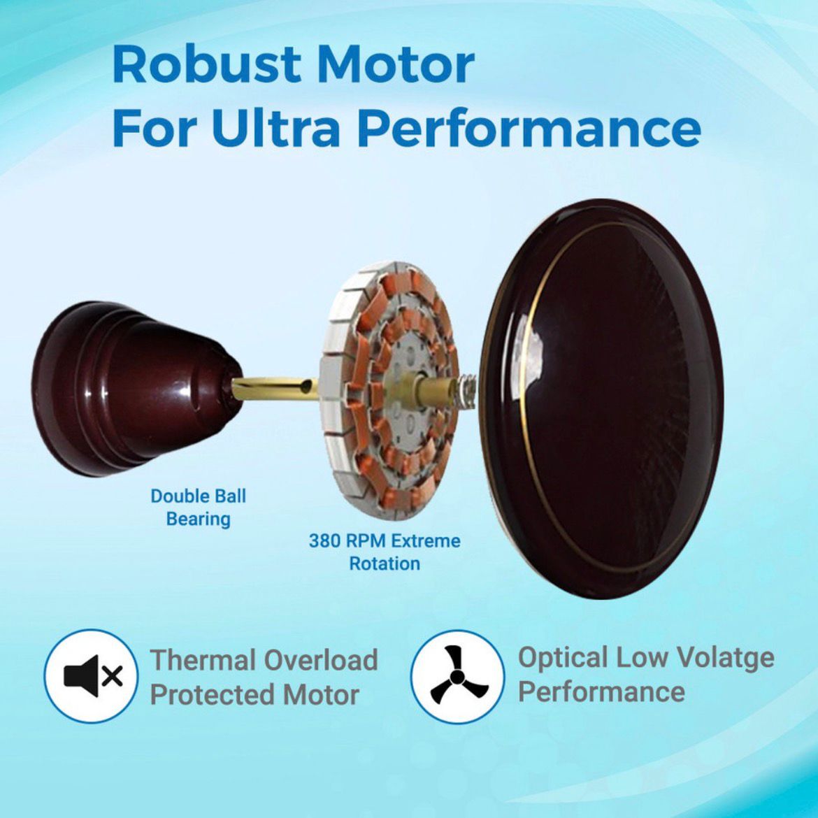 Equipped with a robust motor featuring double ball bearings, this ceiling fan delivers optimal performance with a rotation speed of 380 RPM. The motor is designed for high efficiency, providing an impressive airflow of 7240 CFM. Additionally, the motor includes thermal overload protection, ensuring safety and longevity by preventing overheating.