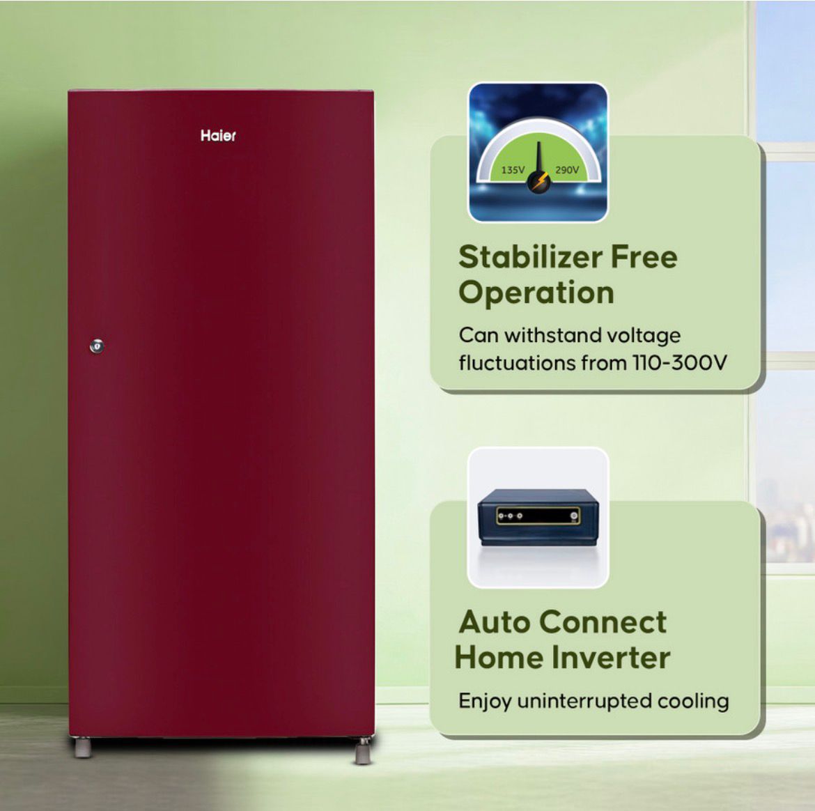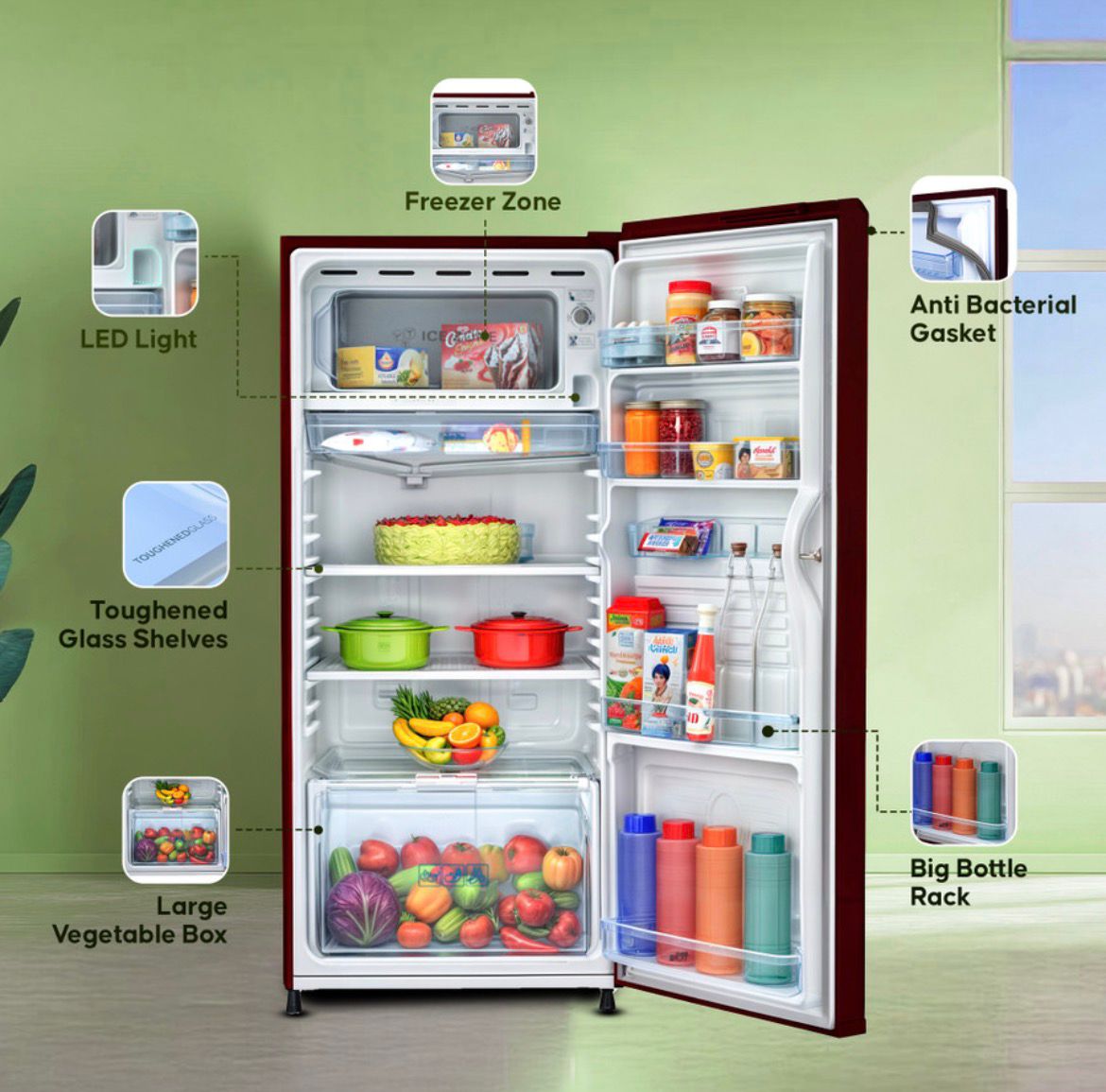 Haier single-door refrigerators offer various features designed to provide efficient cooling and convenience. They’re a popular choice for individuals or small families who don’t require a large amount of storage space or who have limited kitchen space. Diamond Edge Freezing Technology helps in firm ice formation and better cooling retention. This model is designed to operate without the need for an external stabiliser, providing protection against voltage fluctuations and saving space. Durable and easy-to-clean toughened glass shelves provide sturdy support for food items while adding a touch of elegance to the interior. The vegetable crisper in a refrigerator is a specialised compartment designed to store fruits and vegetables at optimal humidity levels, helping to extend their freshness and preserve their nutritional value for a longer period. The door lock feature provides added security to prevent unauthorised access, which is especially useful in households with children. An easy-to-access defrost button allows for quick and hassle-free defrosting, helping to maintain optimal cooling efficiency. They are designed with energy-saving features to minimise power consumption and reduce electricity bills. The refrigerator door is equipped with an anti-bacterial gasket that helps prevent the growth of bacteria and fungi, ensuring hygienic storage conditions.