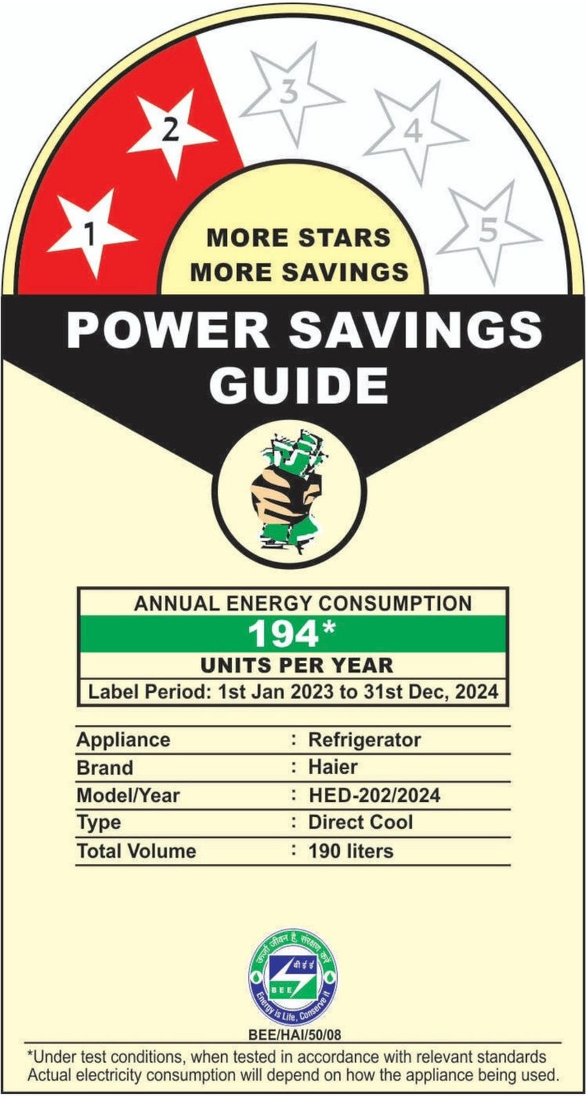 - 2 Star : For Energy savings up to 20%